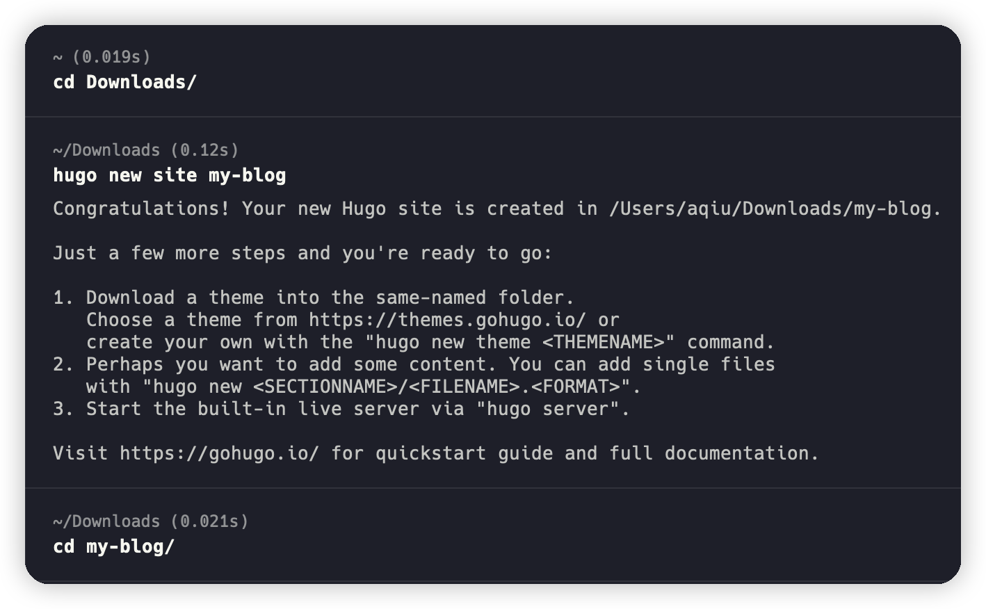 通过终端找到要放置网站的目录后,使用以下命令建立新Hugo站点: